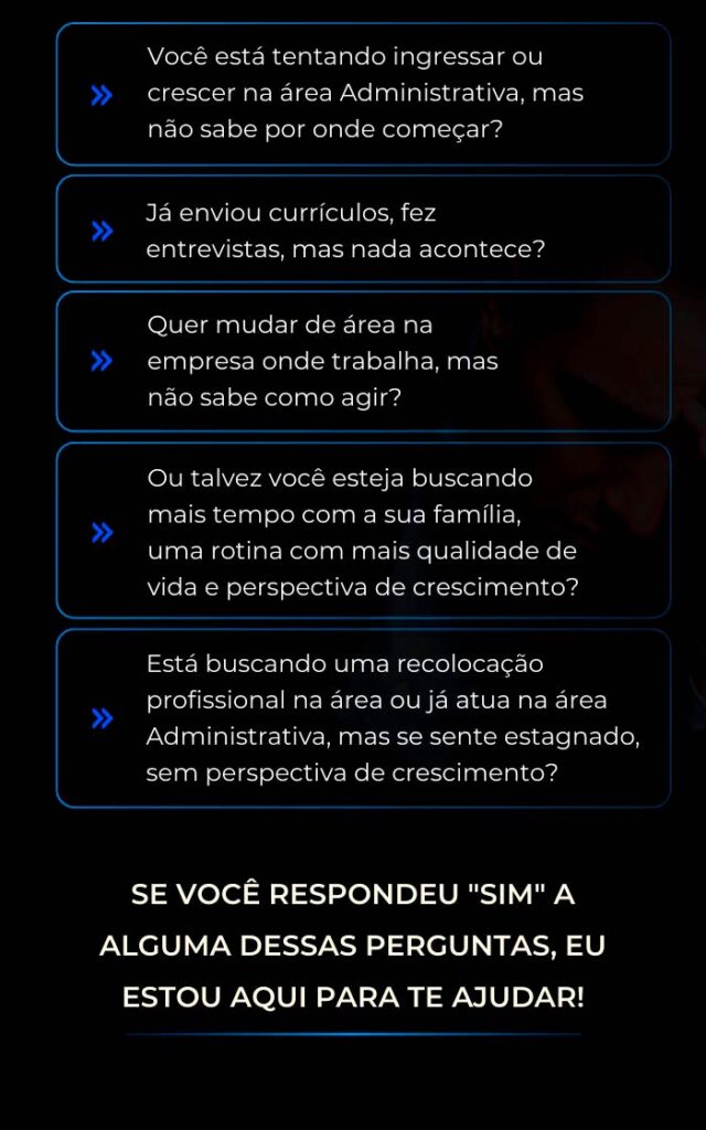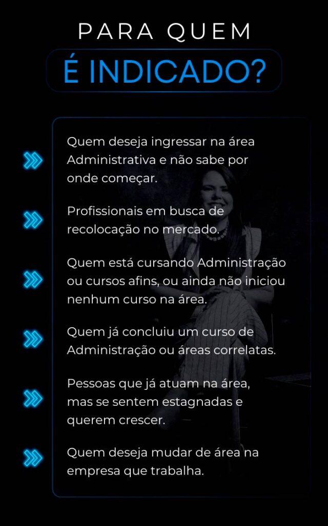Para pessoas que desejam ingressar, se recolocar ou crescer na área Administrativa, tendo ou não experiência ou concluído algum curso na área.